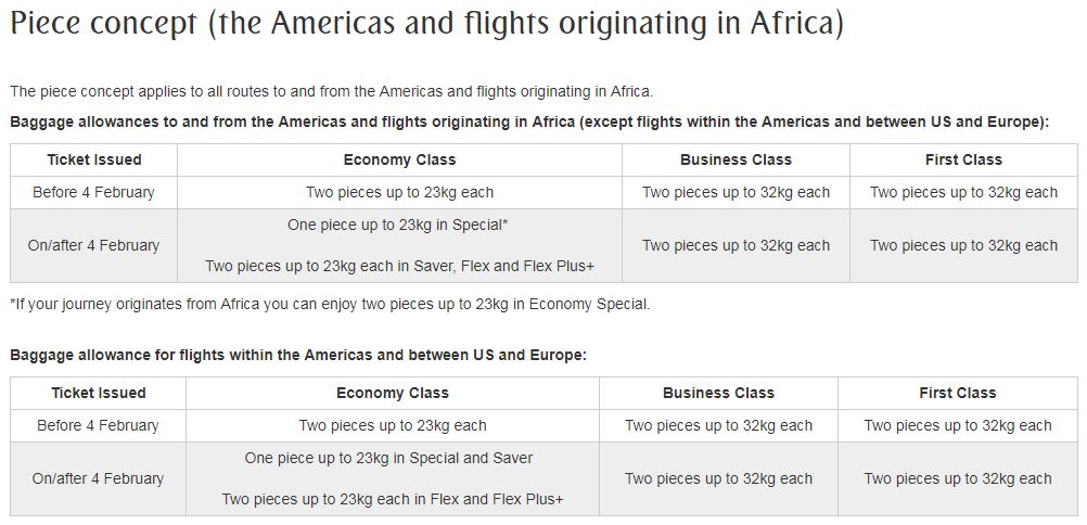 For travel to and from Americas and for flights originating from Africa where check-in baggage allowance is by the number of pieces, Special fare type will receive only one single piece of baggage allowance, up to 23kg. Saver, Flex and Flex Plus customers continue to receive 2 pieces up to 23kg each.