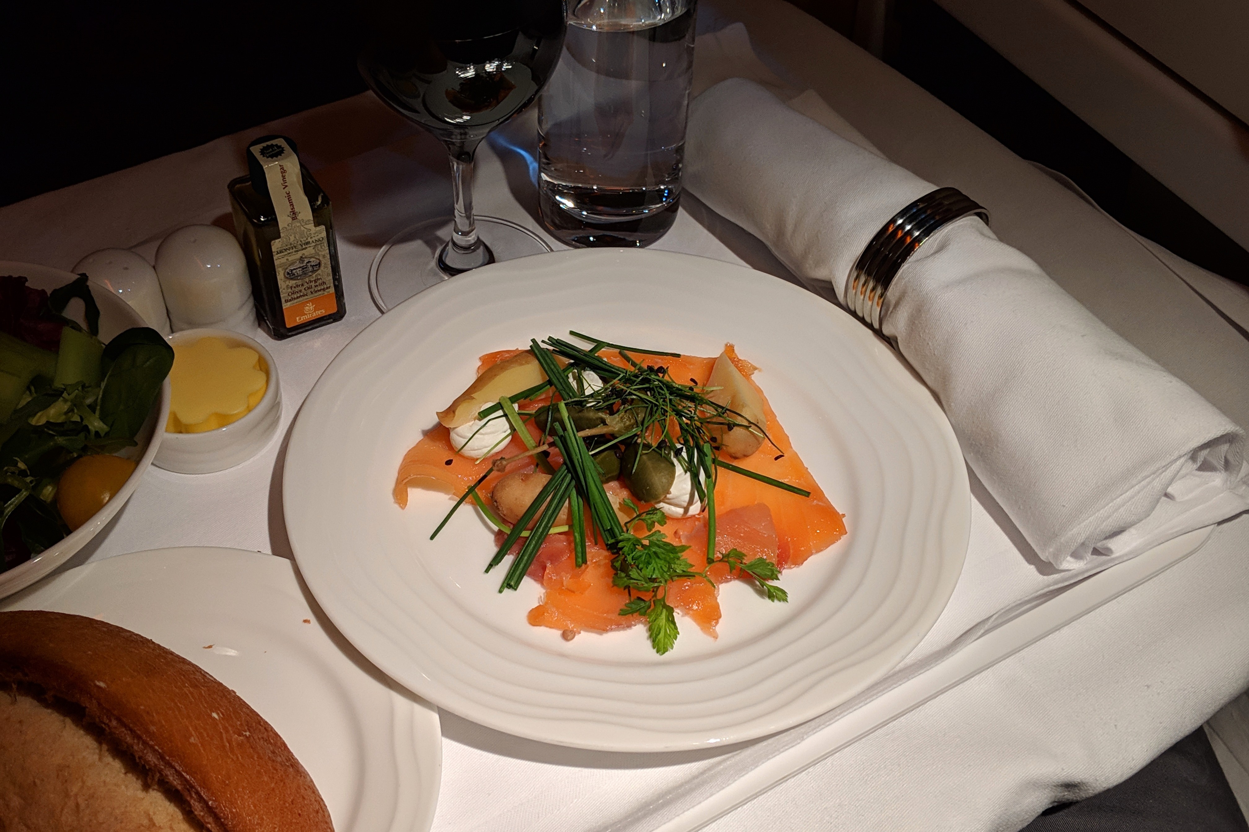 Once we are at cruising altitude, the cabin crew came around to offer mattresses for all the business class passengers, as well as a round of drinks and nuts before dinner was served. As I really liked the Shiraz I had on the the earlier flight from London to Dubai, I decided to stick with that since it was served on this flight as well.