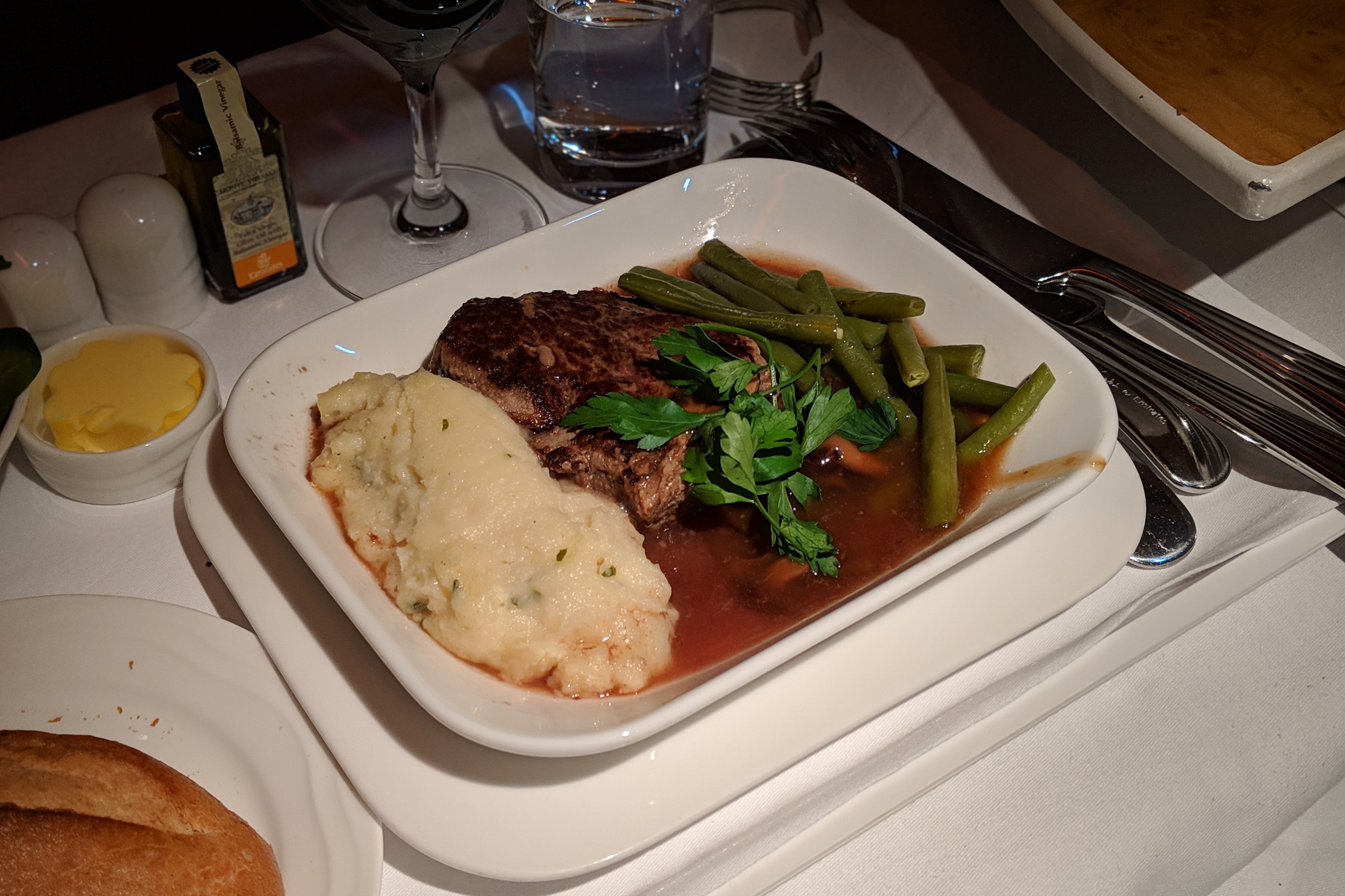 Now, back to the topic at hand: the food. I went for the beef tenderloin, even though frequent flyer collective wisdom typically advise against steaks of any sort. Surprisingly, this was good. Now, I wasn’t sure if that’s an effect of my hunger, but every bite of the beef was sufficiently tender and not overly chewy, which tends to be the case for airline catered beef. I wasn’t expected mash potatoes (it wasn’t clear from the menu), so that on the side was a perfect match to the protein.