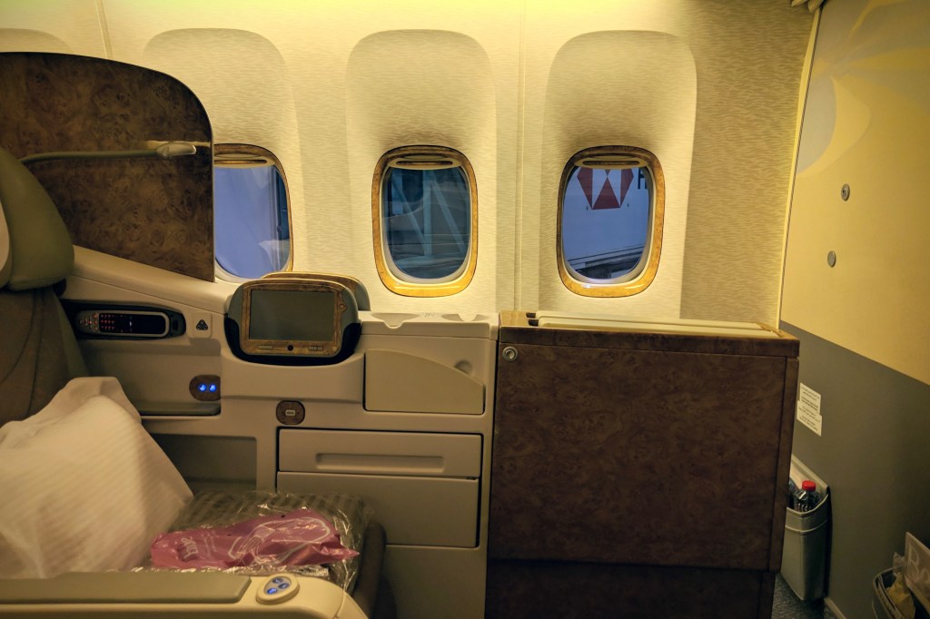 If we put that aside, the seat actually worked for me. While the 2-3-2 arrangement may not work for solo travellers, I saw how it worked for families: two parents with a kid in tow enjoyed having the 3 middle seats, while couples who wanted to seat together weren’t limited to just middle seats. The Emirates seat was adequately designed, with sufficient storage for small items, even though there still isn’t a space for bags. Everything else worked: there was a power socket, USB ports, space for a drink and a place for me to stow my iPad or laptop.