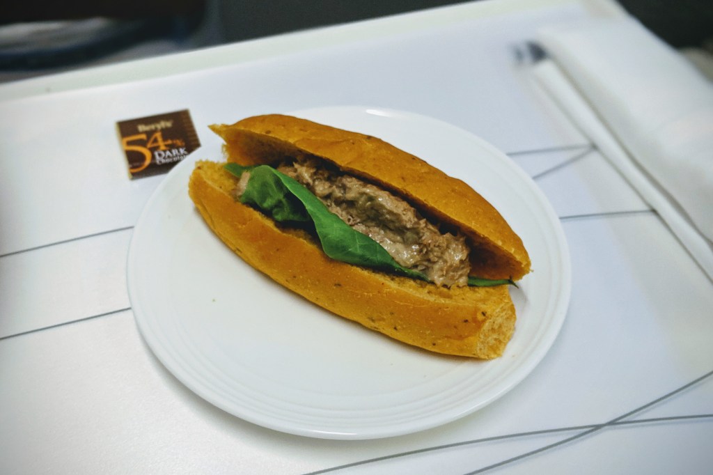 Soon we were on our way. The moment we are at cruising height, the cabin crew around to offer a snack: a choice between a tuna sandwich, or a curry puff. I decided to go with the sandwich, which was quickly brought to me on a tray, with a piece of Beryl’s chocolate.