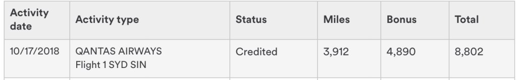 For instance, I credited a one-way business class flight from Sydney to Singapore last year, and for the actual 3,912 miles flown, I got 8,802 miles credited after factoring in the bonuses.