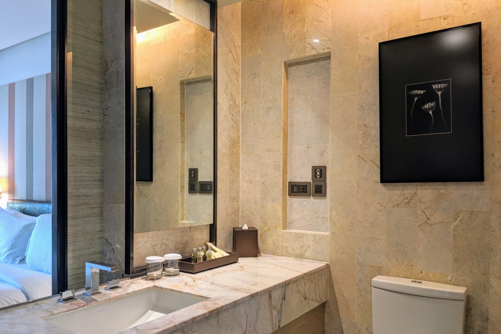 Of course, there are the usual hotel amenities, including a large 40-inch flat screen TV, a mini-bar, complimentary coffee and tea as well as an in-room kettle. There are also some in-room luxuries such as bedroom slippers and bathrobes.
