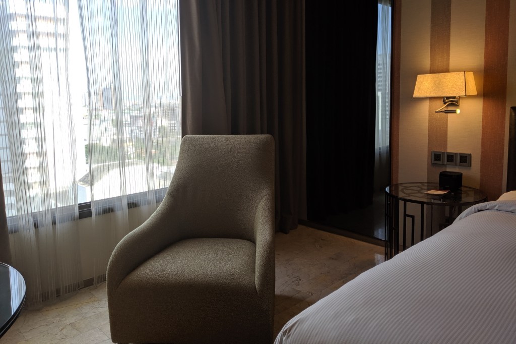 Along with a generous king-sized bed, the room also has an armchair by the side of the window. In lieu of a work desk, there was a round glass-top table with an office armchair, which suffices for your basic hotel-office needs.