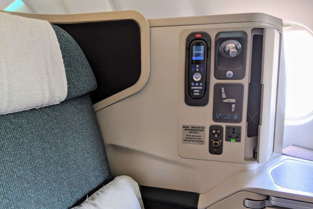 The seat controls are conveniently located at the side of the seat. The entertainment control handset is stowed next to you, with the power socket and audio inputs right next to it. This makes it very convenient to access and use, particularly with the side table right next to all the sockets.