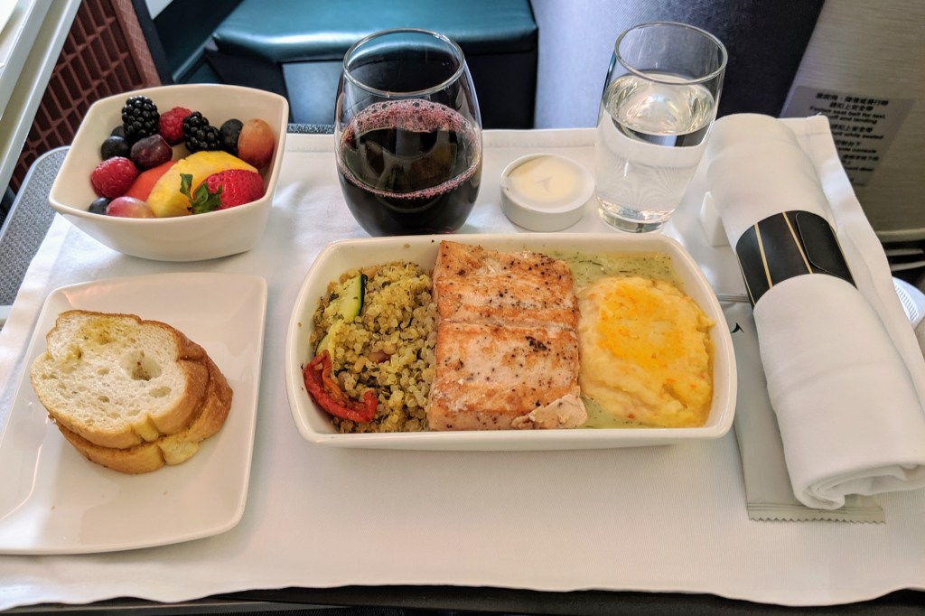 Apart from the menu that was already placed on my seat, what’s good about the Cathay Pacific business class meal service was that the cabin crew will wheel out a trolley with all the mains available, so you can visually take a look at the options before deciding what you want. I always thought this was a much better option, because words can only conjure an image of what the dish might look like, which more often than not turns out to be different from what is plated.