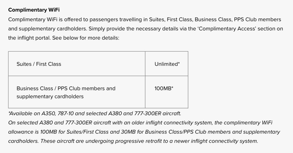 Singapore Airlines first rolled out complimentary wifi for its premium passengers back in February 2018, but up to a nominal limit. Business class passengers and PPS Club members in economy and premium economy were given 30MB, while first and suites passengers were offered 100MB.