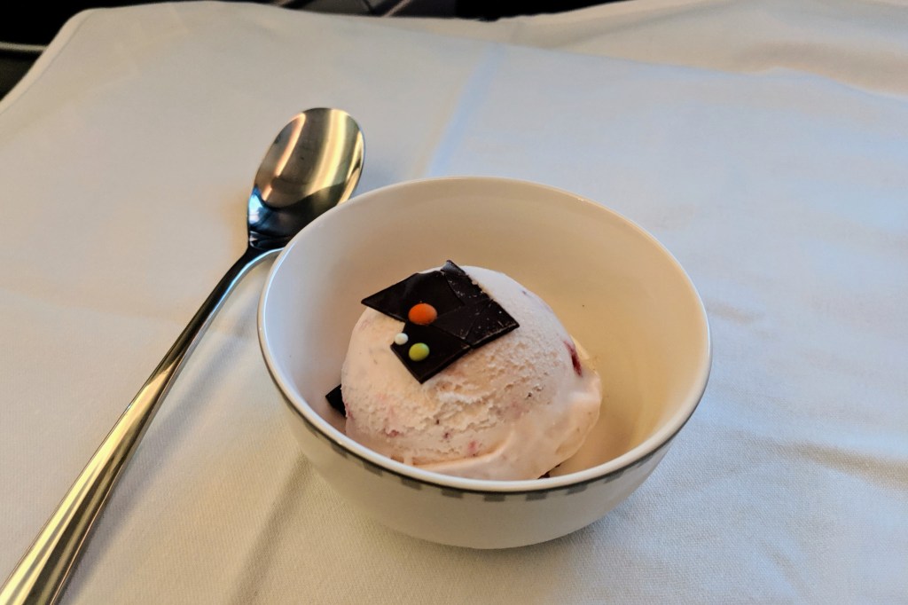 For dessert, there was a choice between the ice cream and a tiramisu. If you have followed me long enough, you will know that I will almost always go for the ice cream. My previous experience with SIA business class desserts have always been disappointing as they tend to ‘overdo’ it, for example adding toppings to the ice cream. However, the ice cream this time round turns out pretty perfect if you ask me: a simple scoop of strawberry ice cream, topped with just a simple wedge of chocolate.
