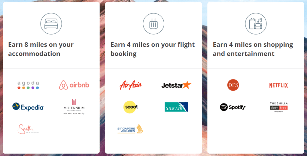 2. Earn 4 mpd on select airlines including SQ; 8 mpd on Airbnb and some OTAs