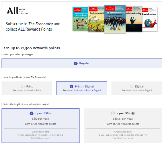 For instance, ALL members who subscribe to The Economist through the dedicated link can earn up to 12,500 Rewards points on a 2-year Print & Digital subscription.