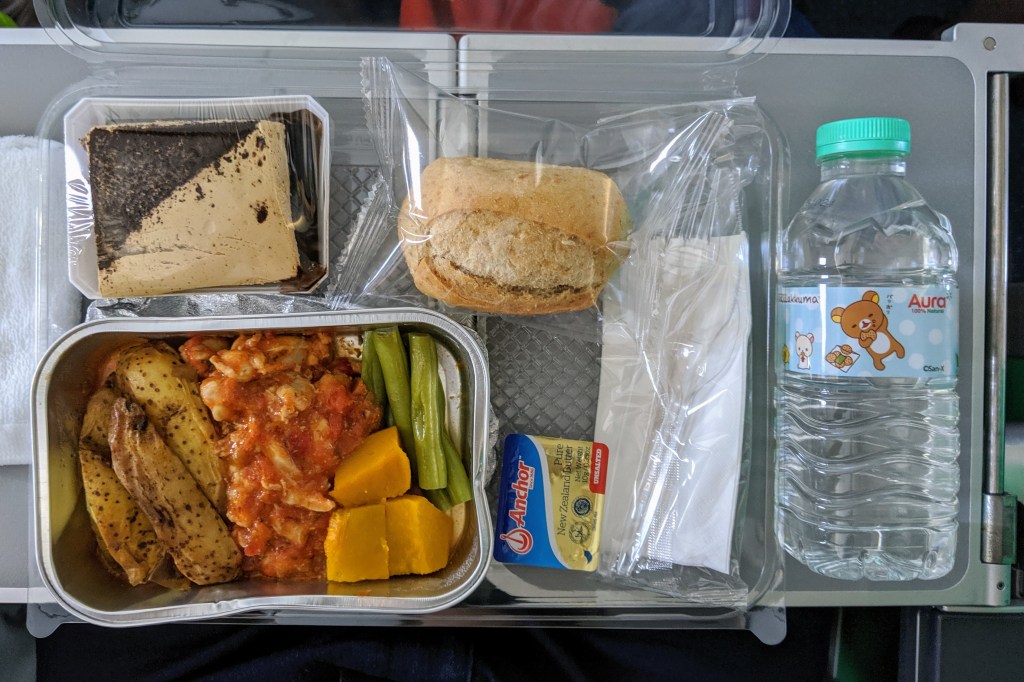 Shortly after that, the meal service commenced. The meal was fairly simple: pieces of chicken along with some potato wedges, pumpkin cubes and long beans, along with a slice of chocolate cake and a packaged bread roll. Everything was nicely encased in a plastic box and served up at once, with the entree piping hot.