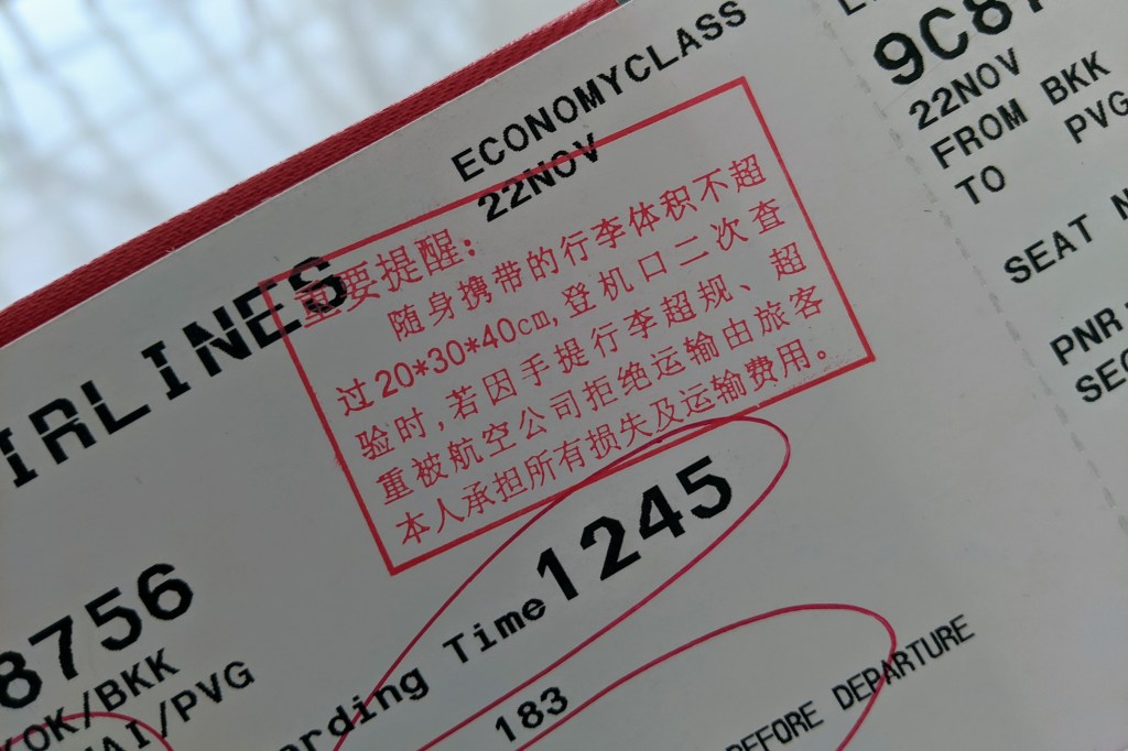 To drive home the point, there was the same notice, in Chinese, being stamped on my boarding pass when I received it. By this time, I was dead certain they were going to weigh my carry-on bags.