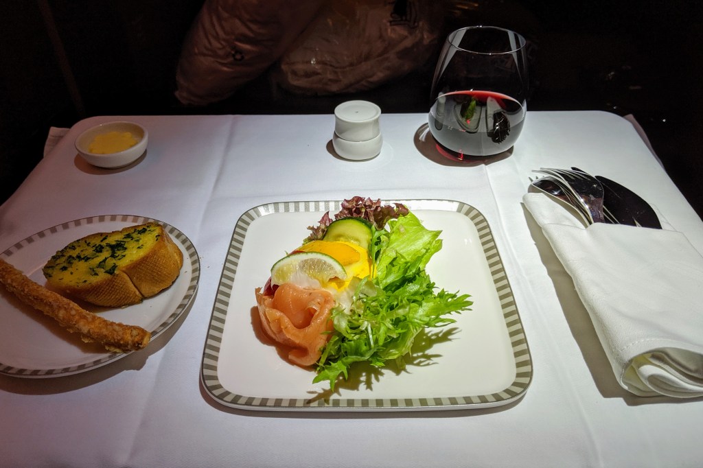 Given the flight duration of five hours, there was only going to be a meal service for the flight. Soon enough, 6.30pm rolled by and the cabin crew came around to lay out the tablecloth and cutlery in preparation for dinner. I was offered a drink once again to go with my meal, and I decided on a red wine, the Chianti.