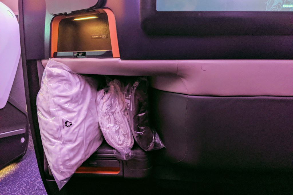 At the side of the seat just below the side table is a control panel for the seat. Unlike previous versions of SIA business class seats, the 2017 version is now fully control by electronics. The seat can be fully converted to a bed at a touch of button, although you can still trouble a cabin crew to do it for you if you prefer that personal touch.