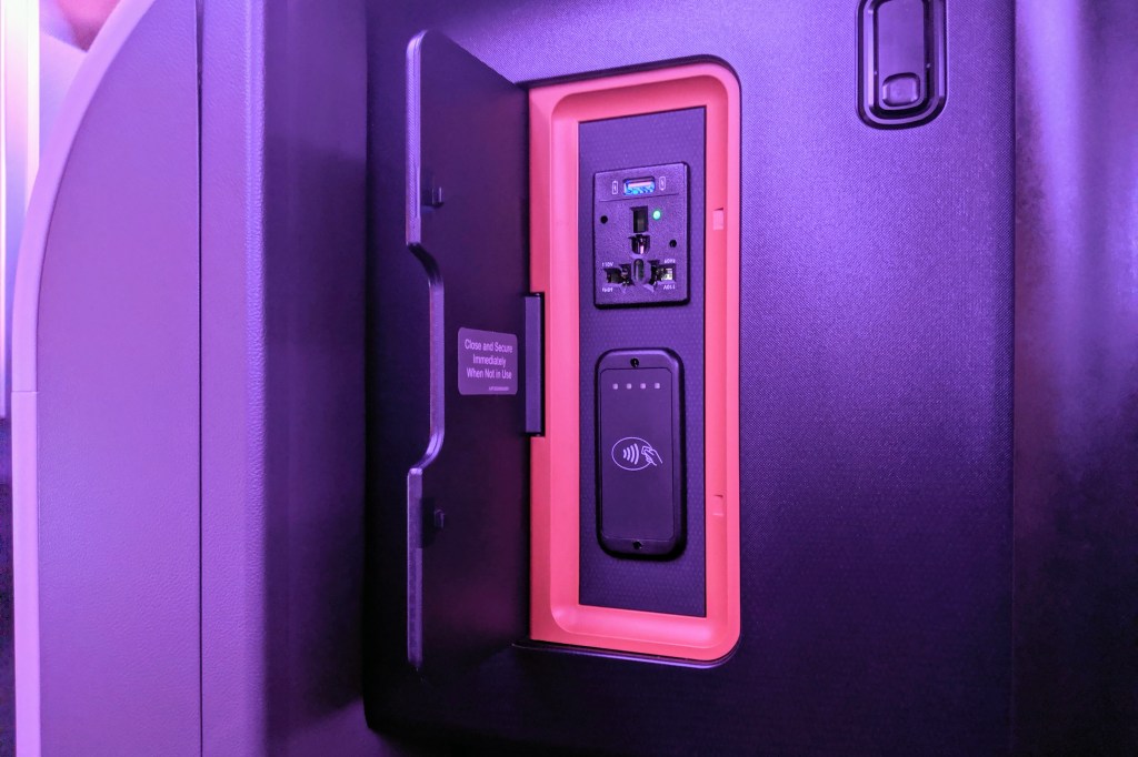 At the back of the side table, there is a small compartment for storing personal , which is also equipped with a USB charging socket. If you need a power socket, it’s available in front of you just below or beside the IFE screen.