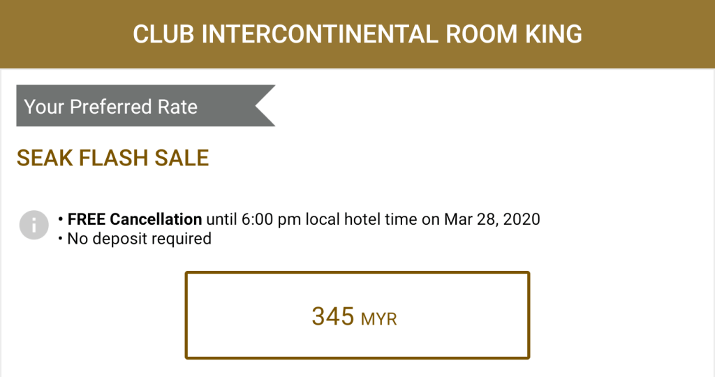 Up north in Kuala Lumpur, Intercontinental Kuala Lumpur is offering its club room for RM345+ per night, working out to another RM380 nett.