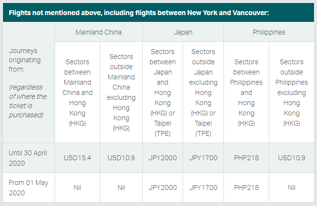 From 1 May, Cathay Pacific will remove fuel surcharges, better known as YQ within the industry, for all flights, except for select journeys from Japan and the Philippines. Note that this date applies for tickets issued from 1 May onwards, and not for tickets issued now for travel from 1 May.