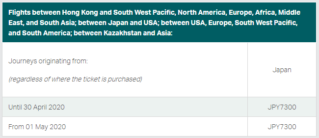 For example, if you bought a ticket that starts from Tokyo to Sydney via Hong Kong, you will pay JPY2,000 (Tokyo to Hong Kong) + JPY7,300 (Hong Kong to Sydney) each way in fuel surcharge – and this will continue after 1 May.