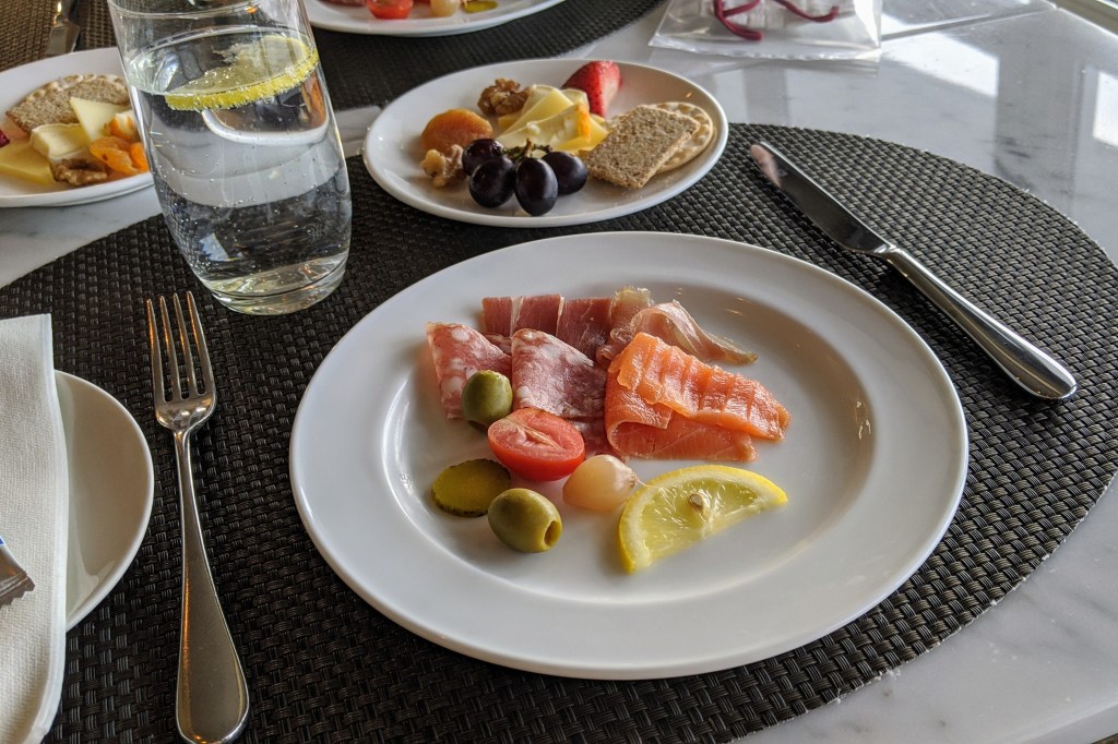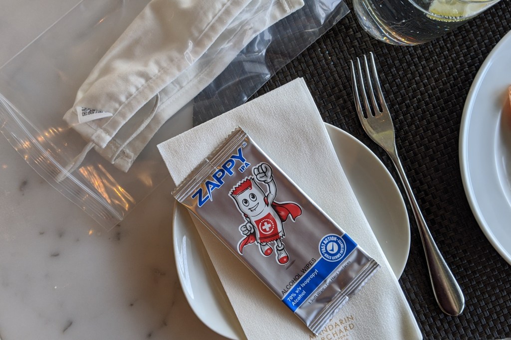 After gawking at the view, I quickly ordered a decaf coffee, and found a seat at a sofa. Then I took a look at the table. While the utensils are laid out, there’s also some new items in this Covid-19 age: a sanistising wipe and a ziplock bag for your face masks.
