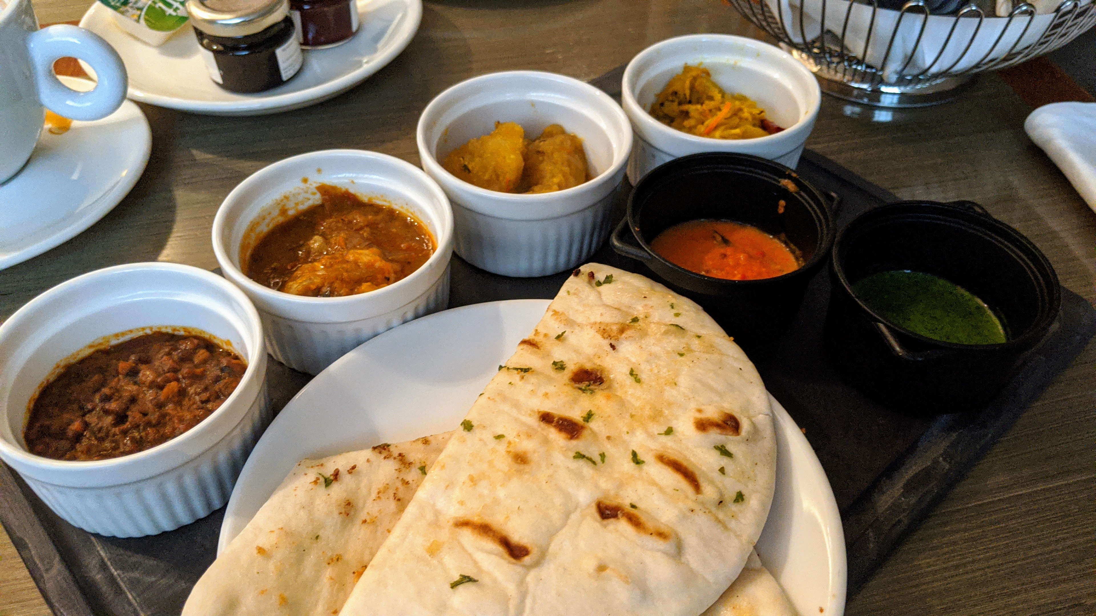 Being unsatisfied with my dim sum, I went on to order a second breakfast, this time the Indian breakfast. The result was much more pleasant, with a warm and fluffy garlic naan and the authentic accompaniments.