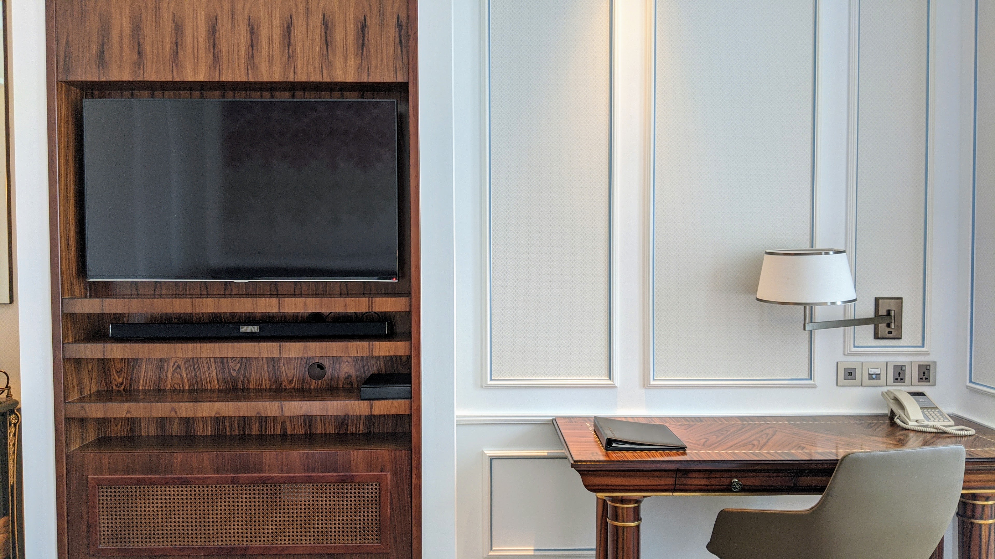 The room also holds a solid working desk with ample power sockets and USB charging points for those work-from-room days, as well as a 50-inch TV with a Bose sound bar.