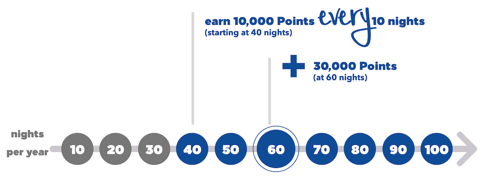 For 2021, you’ll earn the first Milestone Bonus after just 20 nights, rather than after 40 nights. You will continue to earn 10,000 points for every 10 nights thereafter, and a whooping 40,000 points when you reach 60 nights in a year.
