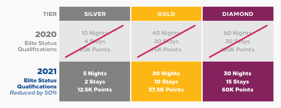 At the top of the tier, Diamond members typically need to clock 30 stays, 60 nights or 120,000 points in a year. In 2021, a member only need to clock 30 nights, 15 stays or 60,000 points to achieve or keep their Diamond status.
