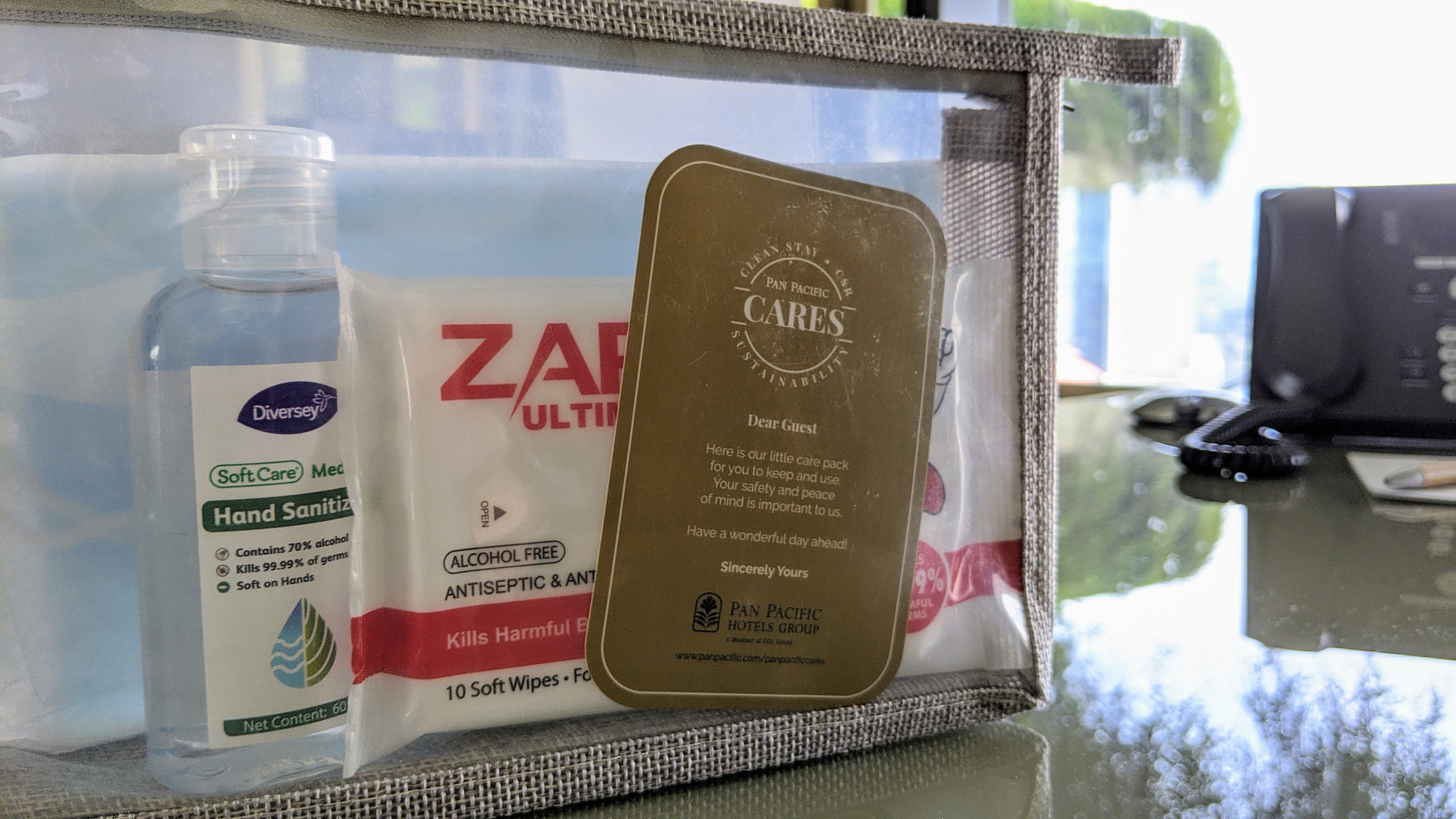 The hotel also provided a care kit, which they called the Pan Pacific Cares kit. In the kit you will find a couple of disposable surgical masks, Zappy antiseptic wipes and a travel-size hand sanitizer all contained in a clear zip pouch. Very handy.