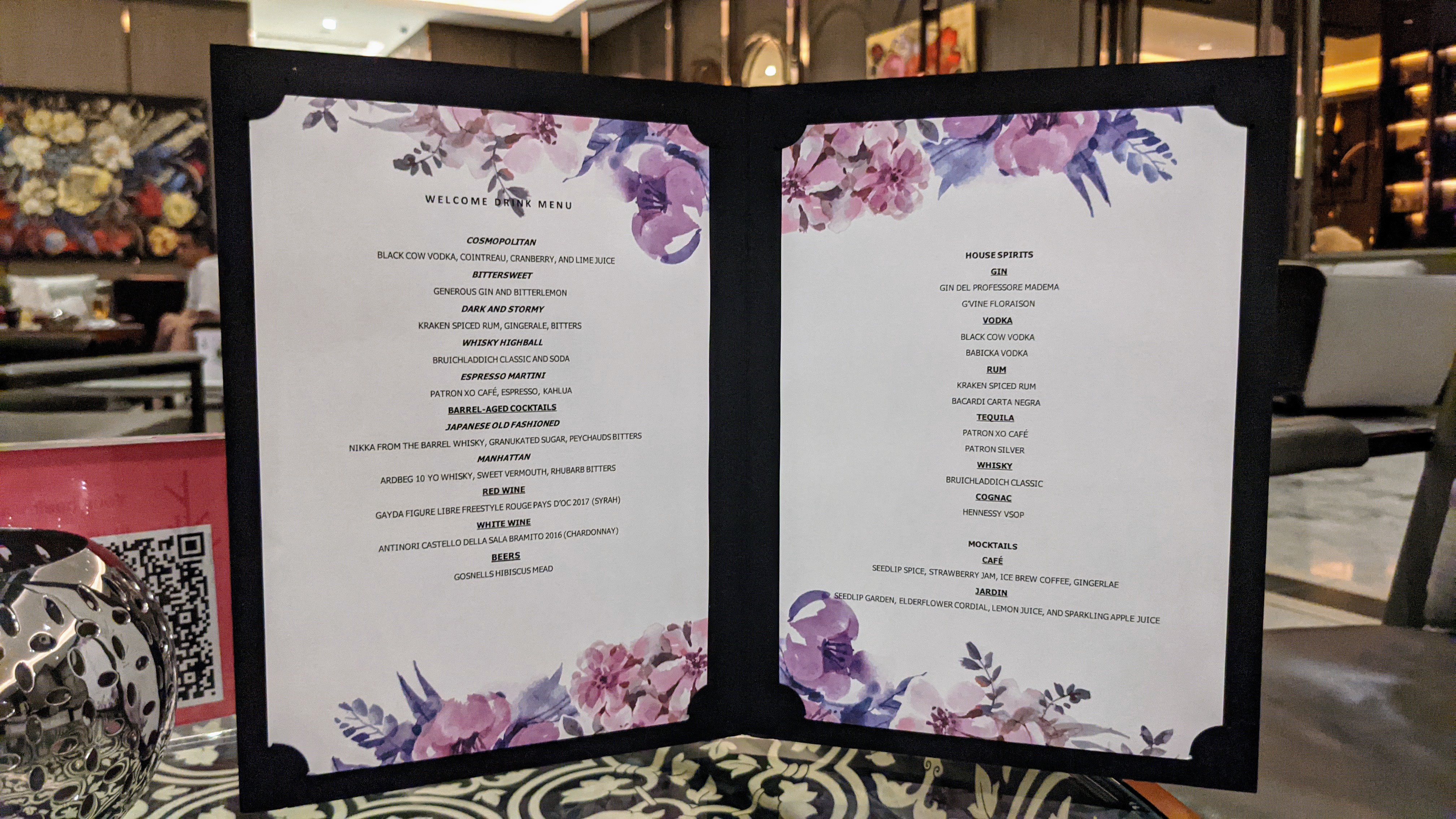 The welcome drinks list is fairly extensive, with a two-page spread of options for you to choose from.