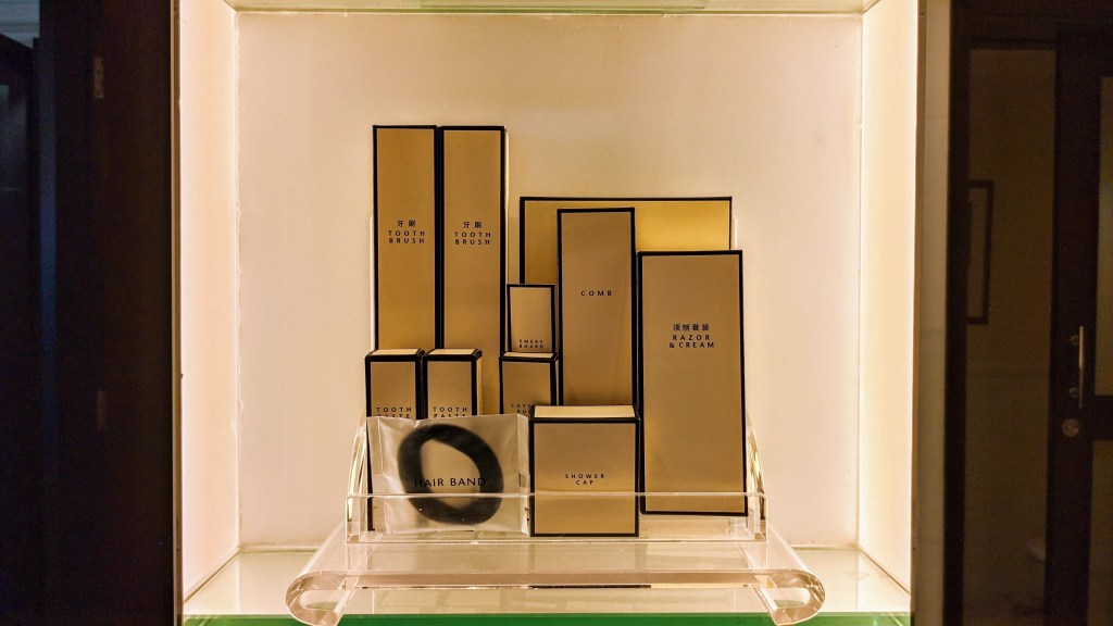 There are also an assortment of disposable bathroom amenities at the washbasins, including a very thoughtful hair rubber band for ladies to use. The housekeeping staff religiously tops up whenever anything on this shelf is being used, but if you do need extra, just give housekeeping a ring and they will promptly bring them up for you.