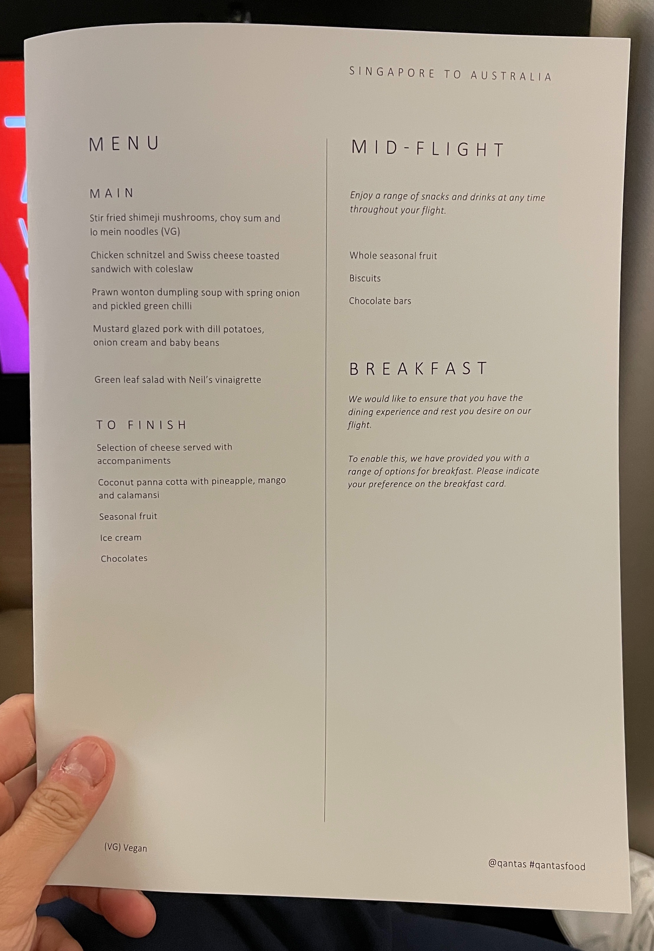 On the side console was a pair of menus, one for the supper service, and a separate breakfast card for me to check off the items I wanted before landing. This card was collected even before the aircraft took off, so that’s some mighty efficiency there.