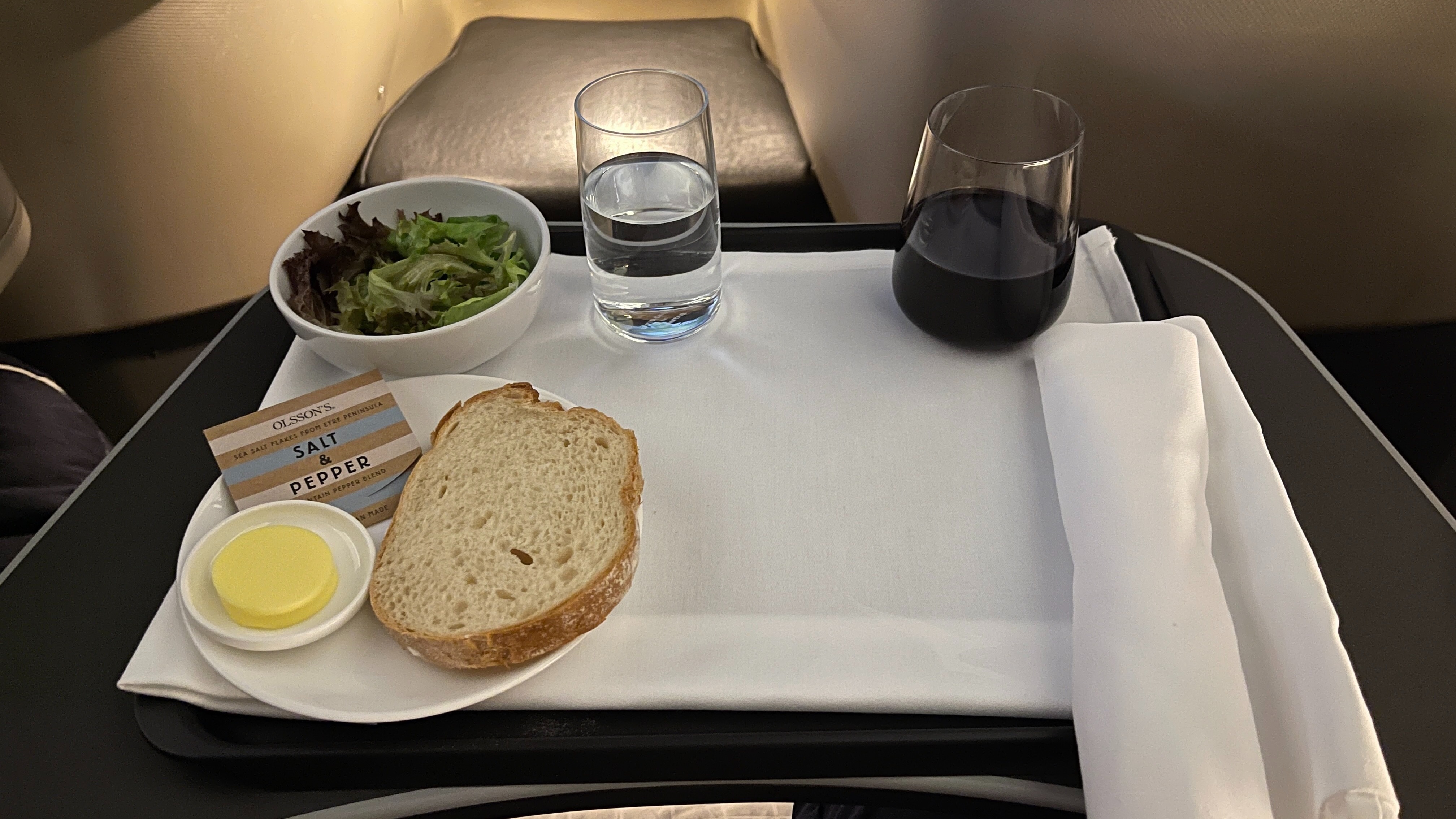 Right after take-off, dinner service commenced at about 9.45pm. The crew pushed a trolley through the cabin, setting up the table setting along with a first choice of drink. Instead of a table cloth, the setting was all done on a pre-set tray: a side salad, a bread plate and the glassware. I took one slice of bread, and went with a glass of red wine.