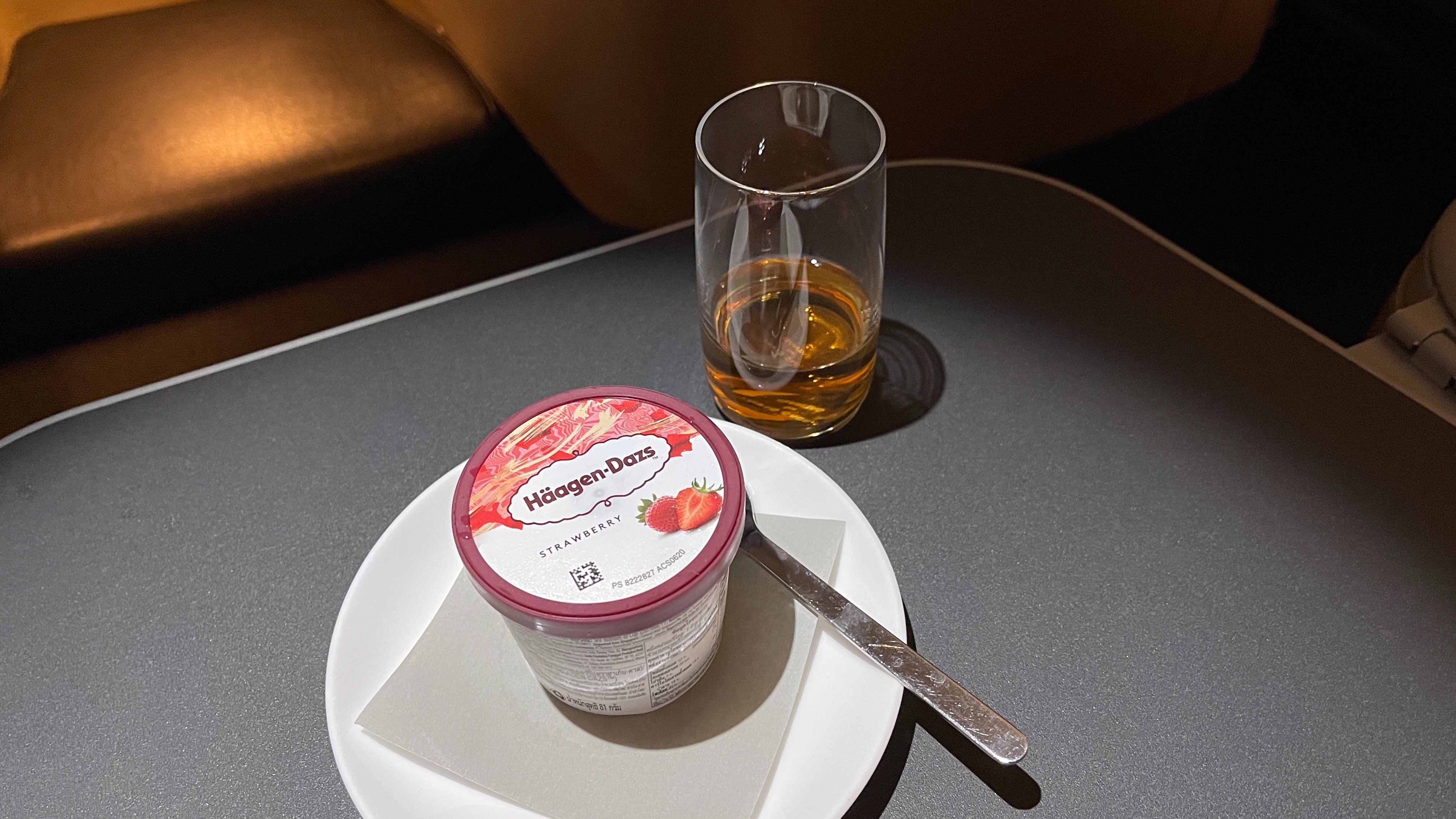 After I was done with dinner, the tray was promptly cleared. The dessert came around in a form of a trolley, which I chose an ice cream from (10.30pm). Out of Singapore, Qantas carries a selection of Haagen Daz ice cream, and the flavour of the day was strawberry.