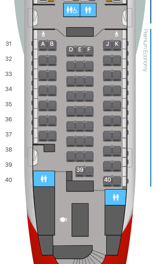 The premium economy cabin also comes with its own dedicated toilets, which is a rarity. This puts the passenger to toilet ratio at 30:1, which is still a decent figure. The pair of toilets are located behind the cabin near the galley.