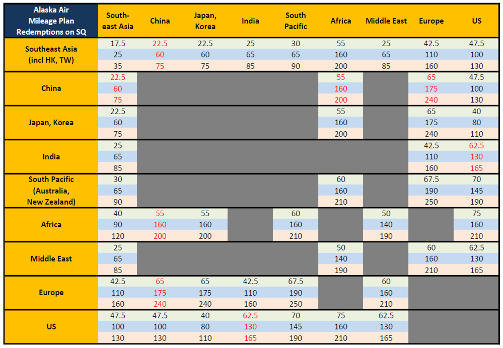 Alaska Air Mileage Plan redemption table for Singapore Airlines flights(updated chart)