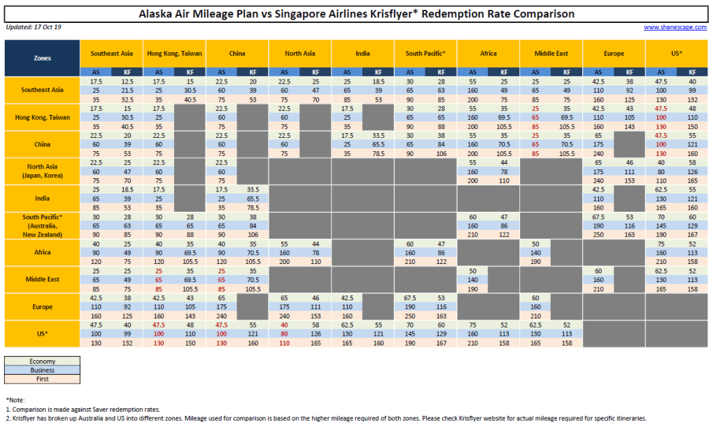 Comparison chart between Alaska Air Mileage Plan & Krisflyer. PDF available here.