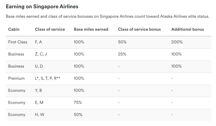 Alaska Air Mileage Plan earn rates for Singapore Airlines-marketed flights