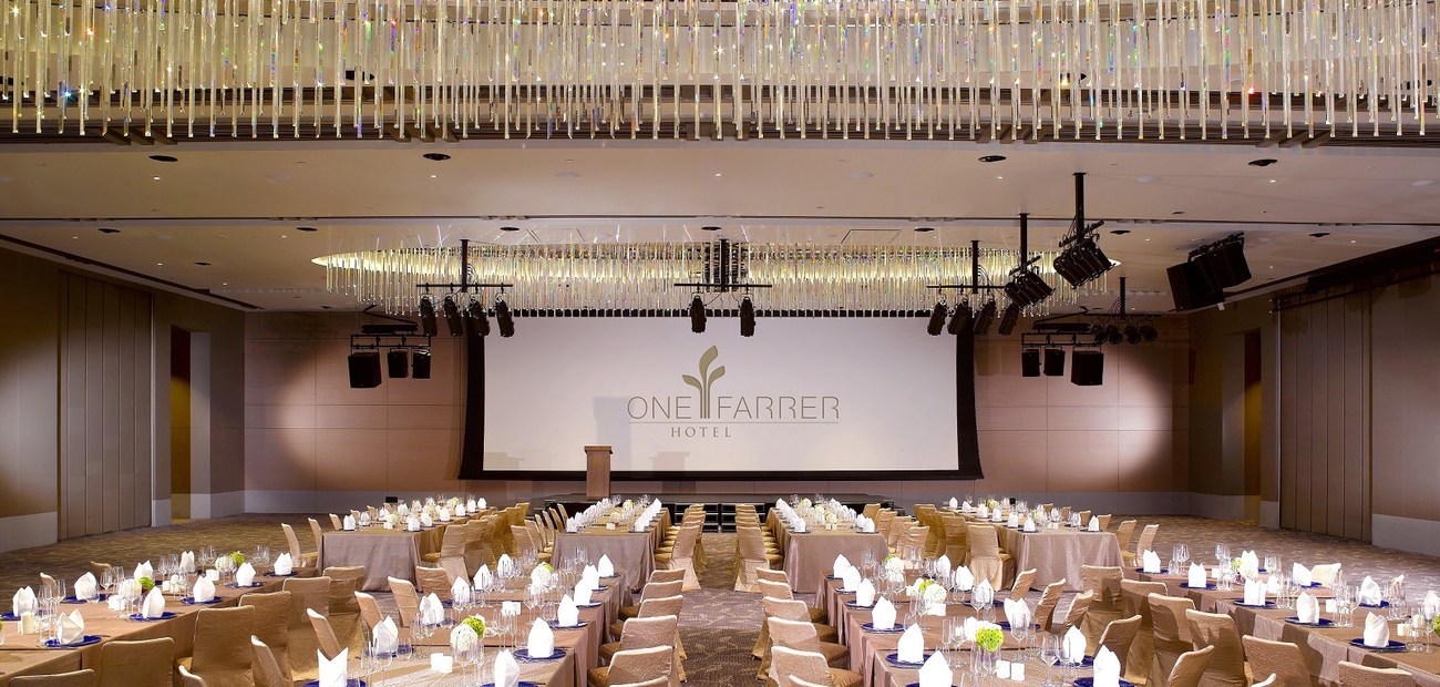 Pre Covid-19, One Farrer Hotel has conference and meeting facilities for up to 700 people at any point in time, including a Grand Ballroom, a Garden Pavilion and three smaller meeting rooms. When first opened, the hotel had a vision to serve a specialised crowd hosting medical-related conference and meetings, mainly due to its relation to the hospital next door. Plans included live-streaming procedures from the hospital, but this proved to be difficult so the hotel has since dropped that vision.