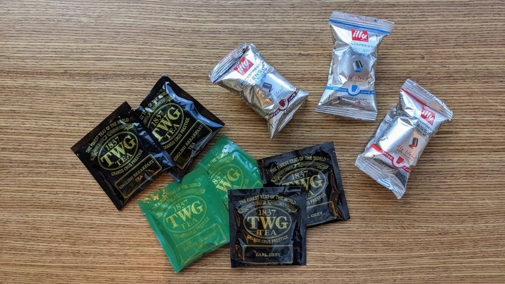 Kettle and coffee machineCoffee pods and TWG tea bags