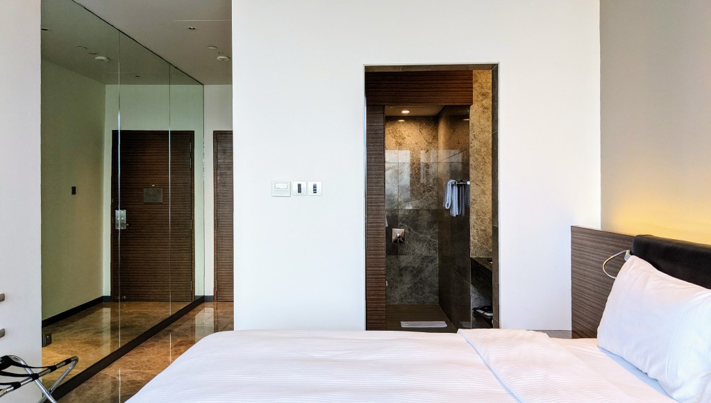 The bathroom takes up the space right next to the main door of the room, but the entrance to the bathroom actually faces the bed. This may be a problem for some people who prefer not having to see the bathroom interiors from the sleeping area.