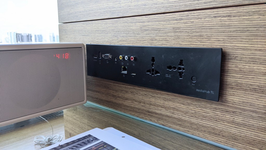 The work desk is a clear glass top that faces the window, with a white Geneva speaker sitting at one corner. The international power sockets, along with all the television input points were nicely built by the side of the table, making plugging in pretty convenient.