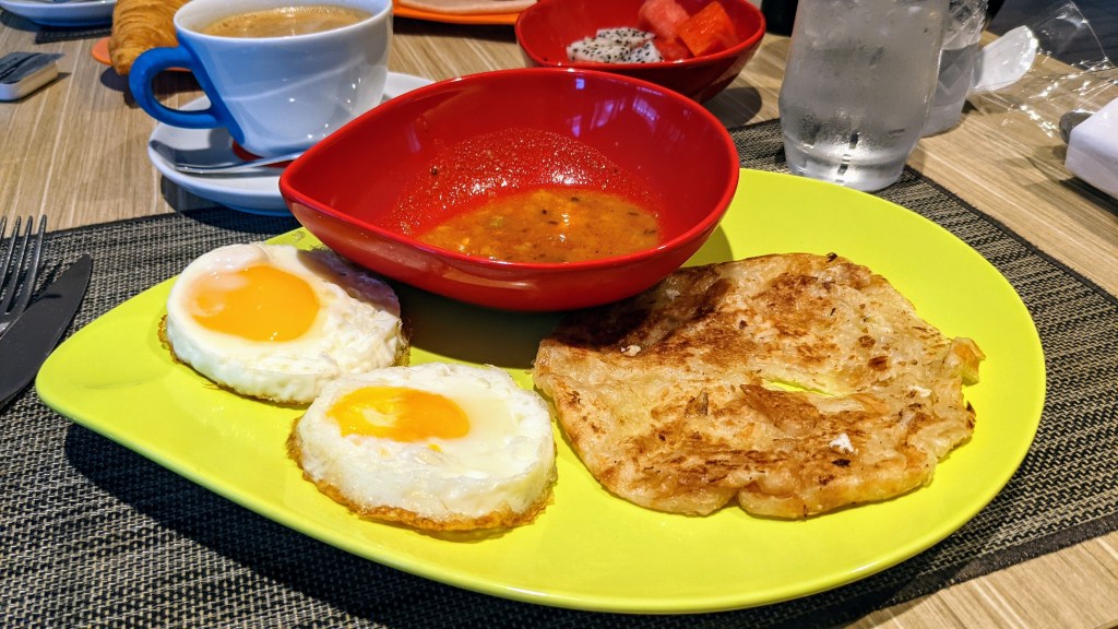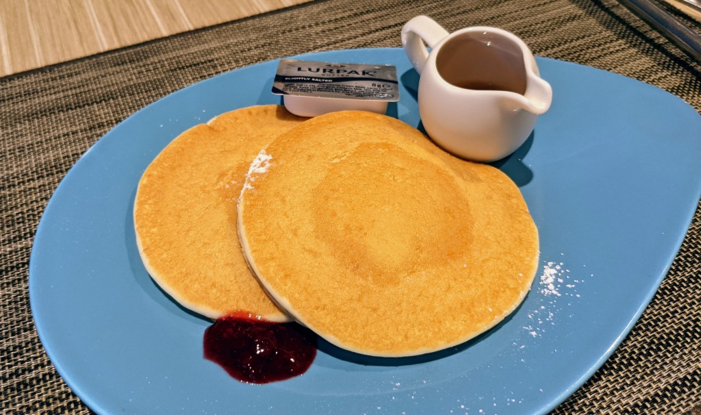 My companion had the ‘daily special’ of pan-fried roti prata with two fried eggs on the side. We also shared a set of pancakes, which came with some syrup, jam and pretty decent butter. Unfortunately, both of which are pretty mediocre.